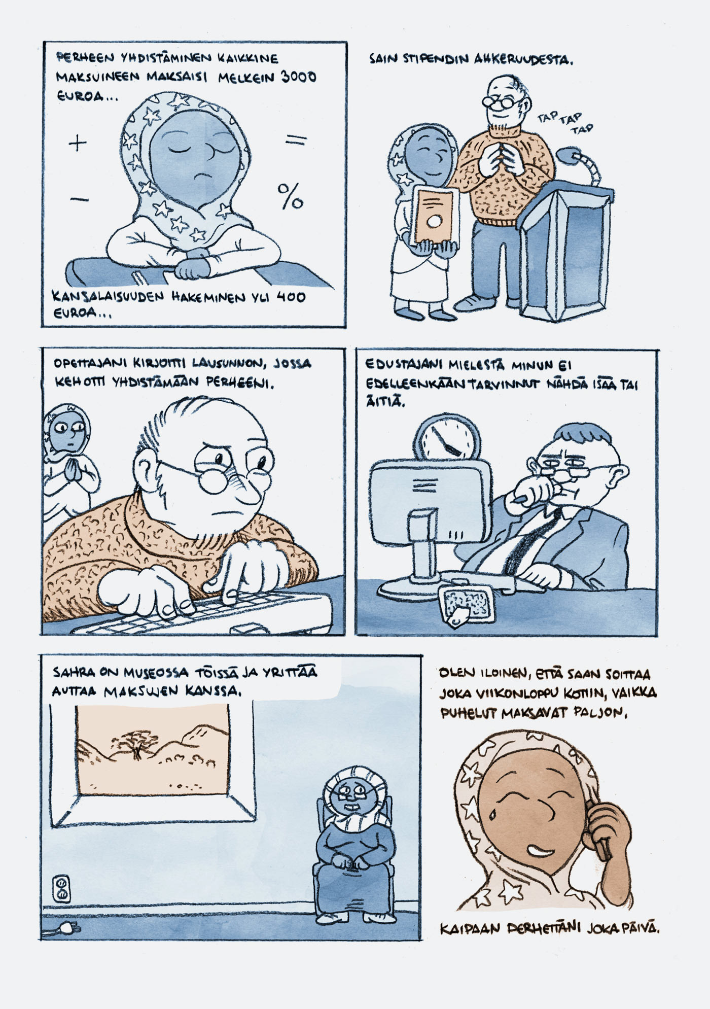 True story of a girl who had to flee her homeland alone at a very young age. Published originally in Voima newspaper in 2014 and later in the comics anthology Mitä sä täällä teet – Tarinoita maahantulosta (Voima Kustannus 2016).